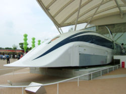 日本爱知博览会展出的JR磁浮MLX01-1实验车 1989年10月20日,日本宣称已制成时速高达517公里的“世界最快列车”。这种超高速磁性悬浮列车改进了去年设计的旧型悬浮列车,把时速又提高了80公里左右。这种列车的车头能挂3—5节车厢,把东京至大阪原先所需3小时减少至1小时左右。