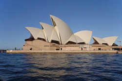 悉尼歌剧院 在澳大利亚港湾,有一座构思独特,设计超群的建筑物,从远处望去,它宛如从蔚蓝海面上缓缓飘来的一簇白帆;而在近处看,它又像被海浪涌上岸的一只只贝壳,斜竖在海边,白色的帆状屋顶由10块大“海贝”组成,最高的那一块高达67米。它就是世界著名的悉尼歌剧院。