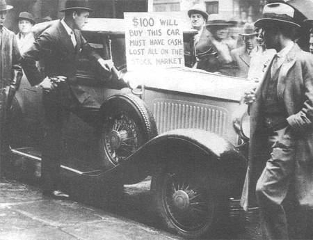 同月,股市价格首次开始下挫,但专家和政府的声明却向公众保证,没什么值得大惊小怪的。可他们大错特错了。在10月24日,股市掉落到谷底。随着股市以平均每天18点的速度狂泻,惊慌失措笼罩了华尔街。由于投机者们蜂拥着争取在股价跌得更低之前卖出手中的股票,股票行情自动收录机已跟不上股市迅速下跌的行情。仅10月24日一天,便发生了1200万笔交易,一个由银行组成的联盟迅速采取行动以控制局势,但这仅仅是暂时的拖延。股价不久便又开始了无情的下跌,到10月29日甚至骤然下跌了平均40个百分点。随着一些主要股票的价格缩减超过2/3,在大崩溃的头一个月便有260亿美元在股市化为乌有。成千上万的美国人眼睁睁看着他们一生的积蓄在几天内烟消云散。但这仅仅是大萧条的第一轮可怕打击。