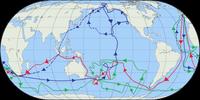 库克的第一(红)、二(绿)和三次(蓝)航海路线