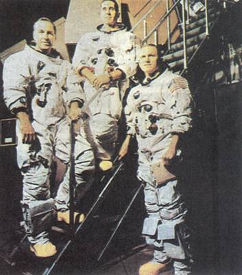 乘阿波罗8号进行首次人类绕月飞行的全体宇航员(自左至右):詹姆斯-A-劳维尔,威廉-安德斯和机长弗兰克-博曼