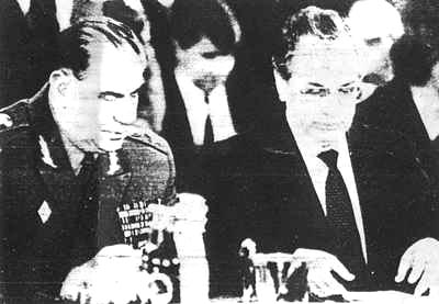 苏联外长别斯梅尔特内赫(右)和国防部长亚佐夫在会议上