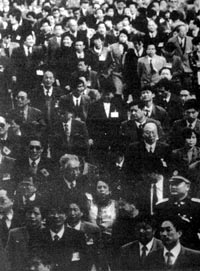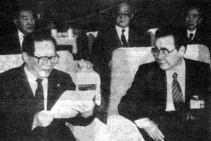 八届全国人大第二次会议开幕前,江泽民与李鹏在休息室交谈