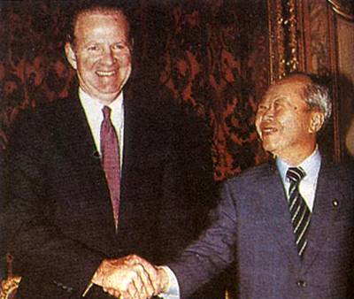 美国从4月17日起,对日本输往美国的彩色电视机、小型计算器等电子产品征收100% 的惩罚性关税(总值3亿美元)。美国指控日本违背两国去年7月签订的半导体协议,廉价倾销芯片,严重危害美国半导体工业的发展和竞争力。这是二次大战以来美国对日本首次实行报复性经济制裁。日本当日向美国提出抗议,并以美国违反关税及贸易总协定为由提出申诉。图为日本大藏大臣宫泽喜一在华盛顿同美国财政部长贝克举行紧急磋商时情景。