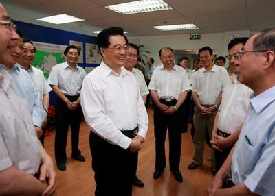 胡锦涛在人民日报社国际部,了解国际新闻采编情况,并同编辑记者亲切交谈。