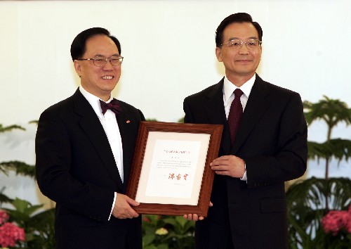 2005年6月24日,香港特区行政长官曾荫权就职仪式在人民大会堂香港厅举行。国务院总理温家宝及吴仪、唐家璇、华建敏、廖晖等出席宣誓就职仪式。就职仪式由国务院秘书长华建敏主持,温家宝监誓。国务院秘书长华建敏主持就职仪式并宣读了国务院任命曾荫权为香港特行区行政长官的第437号令。国歌声中,曾荫权向温家宝总理宣誓就职。温家宝总理向曾荫权颁发了中央人民政府任命书。曾荫权宣誓誓文如下:在温家宝总理的监誓下,曾荫权用普通话宣誓。曾荫权说:“本人曾荫权谨此宣誓,本人就任中华人民共和国香港特别行政区行政长官,定当拥护中华人民共和国香港特别行政区《基本法》,效忠中华人民共和国香港特别行政区,尽忠职守,遵守法律,廉洁奉公,为香港特别行政区服务,对中华人民共和国中央人民政府和香港特别行政区负责。”