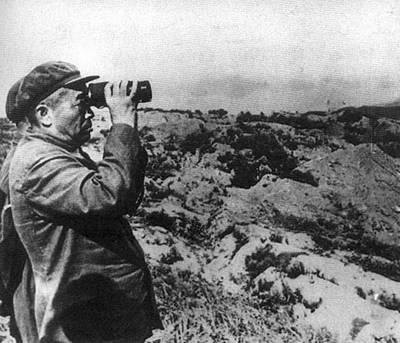 中国人民志愿军司令员彭德怀在朝鲜前线视察阵地