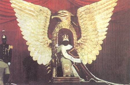 以一只傲慢的铜鹰为陪衬图案的博卡萨在班吉加冕1977年12月4日,前法国殖民军上尉,成为新命名的中非帝国皇帝的琼-比德尔-博下萨的加冕仪式充满了矛盾。博卡萨的御座包围在一只铜鹰中间。他的王冠镶有5000颗金刚钻石。加冕典礼是在被装饰了的体育馆举行的。在加冕典礼上演奏了莫扎特的音乐,但从远处又传来部落的击鼓声。博卡萨为他自己加冕所举行的晚会据报耗资3千万美元,但他的国家属于全世界最贫困国家之一。