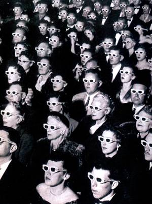 为了把观众从电视夺回来,好莱坞推出了一种新玩艺儿--立体电影。戴着特殊眼镜的观众像在观看《布瓦那魔鬼》及《蜡屋》这类惊险片那样,发现自己躲在逃跑的火车及魔鬼的后面。