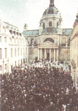 “干了一件导致内战的错事。”戴高乐的讲话在广播中播出,也在电视中播出,但人们看不到图像。因为“电视台”在罢工,总统讲话时,荧屏播映的是他的一个静止的图像。学生们在丹尼尔-科恩-本迪领导下,月初占领索邦,点燃了罢工的火焰。防暴警察3日开进了校园,学生与中数以千计的人被捕,很多人受伤。索邦在700年的历史上,第一次被关闭。