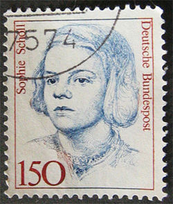德国纪念苏菲绍尔的邮票 苏菲绍尔(SophieScholl,1921年5月9日1943年2月22日)德国人,1940年代慕尼黑“白玫瑰”组织的主要成员,因为参与反希特勒的活动而被逮捕、处决,年22岁。 苏菲绍尔1921年出生于巴登符腾堡的Forchtenberg,她在家中五个小孩中排行第四,七岁时进入小学就读。求学过程顺利,并渡过无忧无虑的童年生活。1930年,她和家人搬到路德维希堡(Ludwigsburg)居住,两年后,搬到乌尔姆,她父亲曾是乌尔姆(Ulm)市长。1942年5月,她进入慕尼黑大学就读,主修生物学和哲学。 1942年的春末夏初,苏菲绍尔和在慕尼黑大学就读医学院的哥哥汉斯绍尔,加入了反希特勒的活动--白玫瑰反抗运动,秘密散发传单。兄妹两人在1943年2月18日散发第六份传单时,遭到盖世太保逮捕,2月22日受审宣判死刑,数小时后被送上断头台。 后有电影《帝国大审判》(SophieScholl,TheFinalDays),拍摄苏菲绍尔被捕、审判及处死前的故事,获得2006年德国电影奖(最佳影片、最佳女主角)、柏林影展(最佳导演、最佳女主角、评审团大奖)、欧洲电影奖(最佳导演、最佳女主角)。