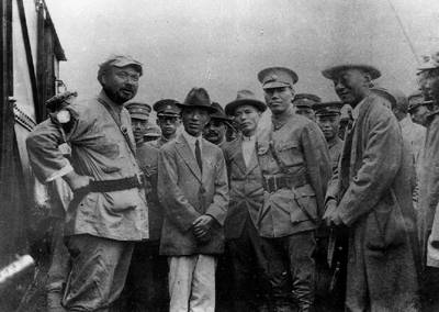 1927年6月20日冯玉祥同蒋介石在徐州开会,决定合作反共、反苏,并促成南京政府和武汉政府合作会后,冯玉祥(前排左1)和蒋介石(前排左3)合影