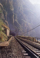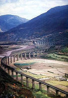 成昆铁路工程艰巨,全线修建各种桥梁991座,总延长92.7km,占线路长度的8.5% ;隧道427座,总延长341km,占线路长度的31.5% ;桥梁、隧道总延长达433.7km,占线路长度的40% 。在桥隧密集的一些地段,桥隧长度竟占线路长度的80% 以上。平均每1.7公里有1座大桥或中桥,每2.5公里有1座隧道,有的地段,桥隧相连,全线桥梁、隧道共计433.7公里,占线路总长的40% 。沿线气候条件很差,有气温高达摄氏四五十度的“火沟”,有10级大风劲吹的峡谷,有常年积雪的雪山。有四五百公里位于烈河度7至9度的地震区。地下水发育,有的断层裂隙水的滴量每昼夜近2万吨,另外还有许多岸冲刷、山体错落、溶洞、暗河、断层、流沙、瓦斯、岩爆,以及有害气体等。所有这些,都给设计和施工带来了很大因难。成昆铁路桥梁、隧道总延长超过了北京至山海关的距离。全线土石方9687万m3;挡土墙和路基加固工程163.4万m3。成昆铁路是一条高标准、高质量的山区铁路干线。高标准、高质量的取得,依赖的是新技术、新设备、新工艺、新结构、新材料和新的施工方法的广泛采用。经过全国各单位1200多名科研人员和工程技术人员直接参加的新技术战斗组与全体筑路人员的努力奋斗,在牵引动力、通信信号、线路上部建筑、桥隧土石方各项工程快速施工等四个方面取得了突破性进展,使我国的铁路修建水平上了一个新台阶。