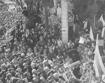 格但斯克的罢工者阅读报上的他们向官方工会的挑战书