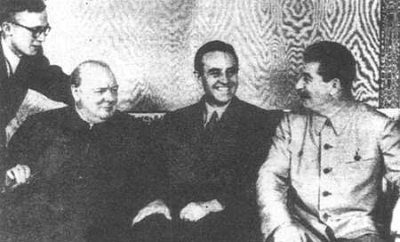 签订会议议定书的丘吉尔、斯大林和罗斯福的代表阿佛拉-哈里曼(右2)